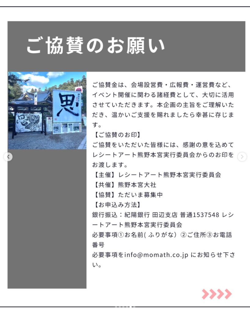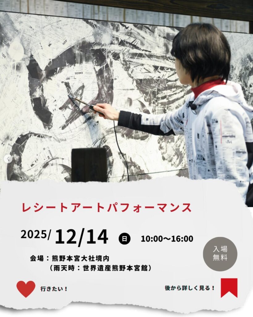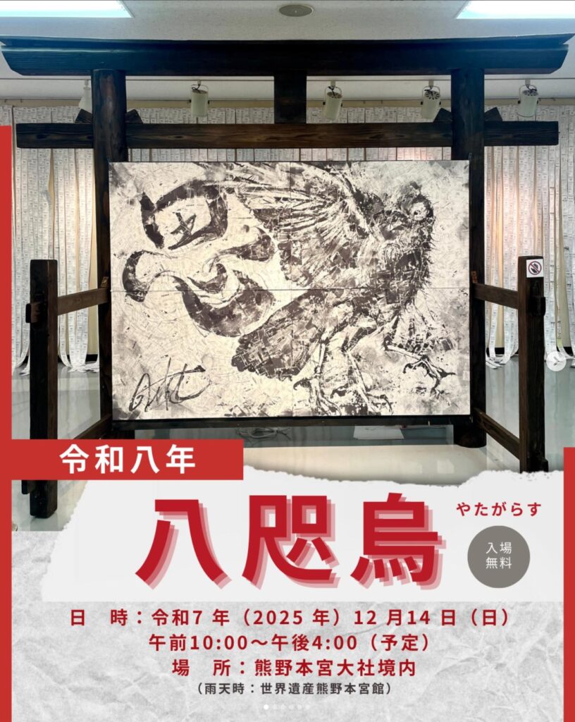 先にご案内のとおり、来たる 12月14日(日)、熊野本宮大社 境内にて、現代美術家 VIKI によるレシートアート・パフォーマンス「令和八年 八咫烏」 を開催いたします。本ページでは、開催にあたり 詳細情報 をご案内いたします。